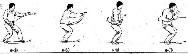 要领 a、右拳回拉与左脚里扣动作要上下和谐。 b、扣左脚时上体不要前俯后仰.更不可突臀或长身。