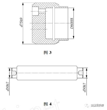 如图3,在被测工作截面较短的情况下,可用改测直线度以替代同轴度的变通方法。因为这种情况下轴的倾斜对工件装配影响较小,而轴心偏移对工件装配影响较大,测量轴心偏移实际上就是测量轴心连线的直线度。具体实现方法为:分别在两个小圆柱上测量n个截面圆,然后选取这n个圆的圆心拟合一条三维直线,该直线的直线度可近似替代同轴度(同轴度=2×直线度)。工作截面越短,该方法效果越好,并且可很方便地制作一个综合量规来验证该方法的准确性。如图4所示,要求两端部相对轴线的同轴度为d0.03,直接手动测量两侧圆柱或者通过构造两圆柱,构建轴线,算出与轴线的距离,乘以2就是同轴度值。