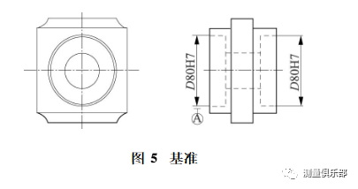 如图5所示,两D80的孔左侧为基准A,要求右侧孔相对基准同轴度D0102,此时只能分别测头A90B9,A90B180两方向测量,建立公共轴线,求右侧孔对基准的同轴度,直接评价即得结果。