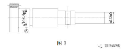 同轴度用常规工具比较难测,在日常工作中常用测量跳动的方法代替。测量跳动的方法一般是用偏摆仪顶住两个中心孔或者用车床夹持,这样旋转零件,看百分表(或千分表)的数值。如图1所示,d168.4g6为基准A,要求测量d155n6对基准A的同轴度d0.05。将最左端夹在车床卡盘上,在顶尖部用百分表先打基准找正,再将表移至d155n6端,观察此时表的读数差值,即为同轴度值。