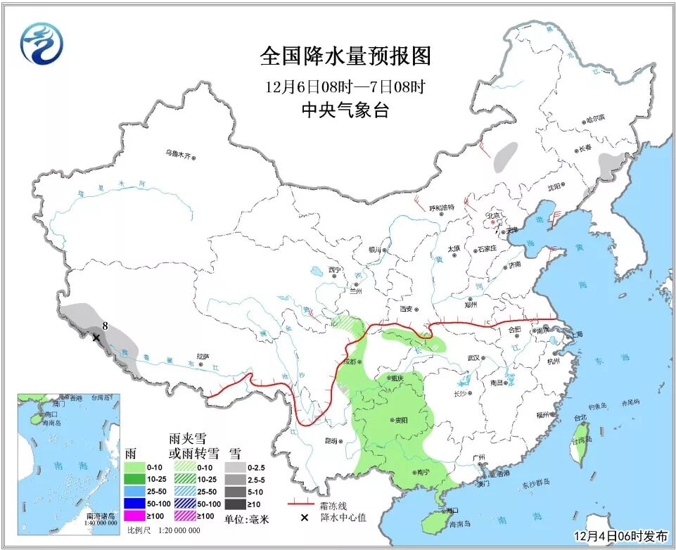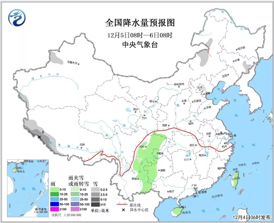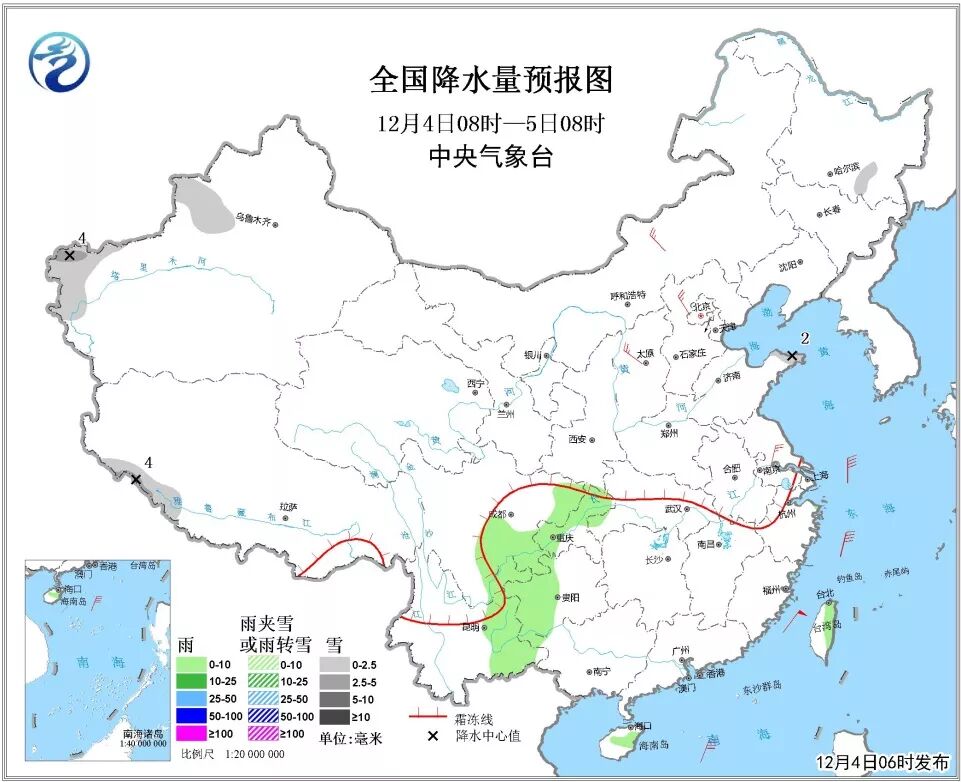 昨日,全国大部降水较弱,新疆西部局地出现4毫米降雪。