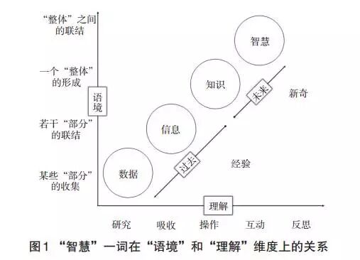 在计算机领域,智慧一词从语境和理解两个维度,经历了从数据(Data)到信息(Information)、再到知识(Knowledge)和智慧(Wisdom)的过程。过去人们更多关注“数据”和“信息”,强调对经验的理解;未来人们将更多关注“知识”和“智慧”,重视对新奇事物的探究。从“理解”的维度来看,研究、吸收、操作、互动和反思是人类认识知识的五个阶段和过程,也可以简单理解为是数据挖掘的过程。从“语境”的维度来看,“数据”强调对某些“部分”的收集,“信息”强调若干“部分”的联结,“知识”强调一个“整体”的形成,“智慧”则强调多个“整体”之间的联结(见图1)。