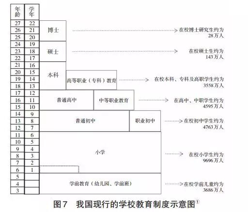 在现代社会中,建立能充分发挥各类教育机构整体功能的教育制度是培养卓越人才的基础。顾明远在《教育大辞典》中给出的教育制度的定义是:“一个国家各种教育机构的体系,包括学校制度和管理学校的教育行政机构体系。”可见,教育制度是指一个国家各级教育机构的系统和管理规则,包括两个组成部分:一是各级各类教育机构的系统,二是教育机构系统赖以存在和运行的一整套规则(如义务教育制度、高等教育的学校教育制度、职业教育制度、成人教育制度、招生与考试制度、学业证书制度、教育督导制度、学校及其他教育机构的教育评估制度等)。其中,学校教育制度是教育制度的核心部分,也是一个国家教育制度的代表。我国现行的学校教育制度示意图(见图7)揭示出我国当前贯穿学前教育、小学、初中(普通初中和职业初中)、高中(普通高中和中等职业教育)、本科(含高等职业教育)、硕士、博士的教育结构体系。