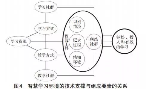 智慧学习环境主要由学习资源、智能工具、学习社群和教学社群四大要素构成,而且学习社群与教学社群之间是相互关联的,同时智慧学习环境要考虑学习者的学习方式和教师(设计者)的教学方式。换言之,智慧学习环境的构成应与具体的教学方式和学习方式相关联,不存在统一的、笼统的智慧学习环境。智慧学习环境的技术支撑与组成要素的关系如图4所示。
