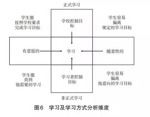新型教学模式已突破了学校教育提供的正式学习,而走向正式学习和非正式学习的融合。这两类学习的主要区别在于:正式学习是学校控制教学目标和教学进度,而非正式学习则是学习者自己控制学习目标和学习进度。如果再考虑上学习者的意愿,那么其学习就会表现出四种特征:一是学生容易偏离规定的学习目标,二是学生能够按照学校要求完成既定的学习目标,三是学生能找到他需要的学习,四是学生容易偏离他意向的学习目标(见图6)。