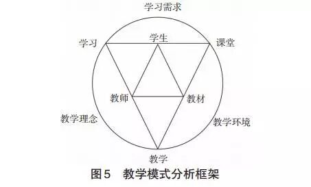 由于传统的教学模式较为忽视学生的个性发展,学生的创新思维受到抑制,因而难以适应科技和社会发展对人才的需要。现阶段我们正在经历一场“教学模式危机”,人们对创新教学模式的呼吁越来越强烈。(祁映宏等,2005)随着信息技术的引入,创新的教学模式正以全新的形态不断涌现,并影响着教育实践。教学模式的分析框架主要包括三个层面(见图5):一是宏观层面,包括教学理念、教学环境和学习需求三个要素;二是中观层面,包括教学、学习和课堂三个要素;三是微观层面,包括教师、学生和教材三个要素。在信息时代,随着技术逐步融入课堂教学中,传统的教室环境发生了较大的变化,因此催生出学习新方式、教学新方式和课堂新形态的变革。