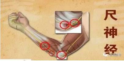 尺神经发出的感觉支有:①掌皮支,分布小鱼际肌表面的皮肤;②背皮支,分布于手背尺侧和小指、无名指尺侧半背面的皮肤;③终末浅皮支,分布于手掌尺侧面远端皮肤和小指、无名指尺侧掌面的皮肤。