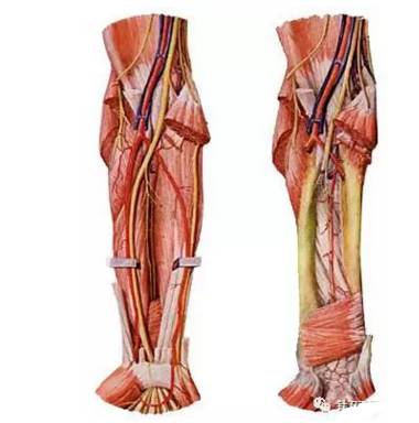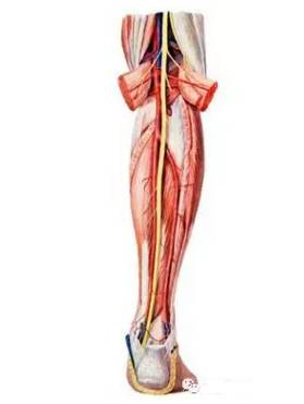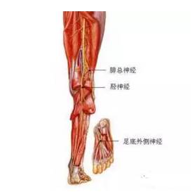 胫神经为坐骨神经本干的直接延续,在腘窝内与腘血管伴行,在小腿经比目鱼肌深面伴胫后动脉下降,过内踝后方,在屈肌支持带深面分为足底内侧神经和足底外侧神经二终支入足底。足底内侧神经,经拇展肌深面,沿足底内侧前行,分布于足底肌内侧群及足底内侧和内侧三个半趾跖面皮肤。足底外侧神经,经拇展肌及趾短屈肌深面,至足底外侧向前,分布于足底肌中间群和外侧群,以及足底外侧和外侧一个半趾跖面皮肤。胫神经在腘窝及小腿还发出肌支支配小腿肌后群。