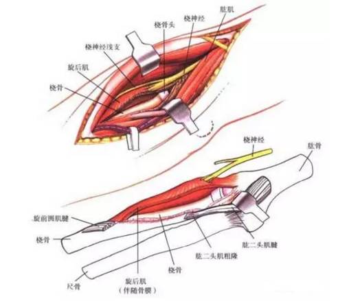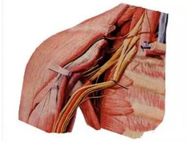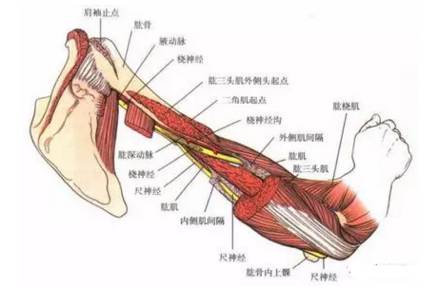 由第5~8对颈神经和第1对胸神经的前支进入后束发出而形成。在腋窝内位于腋动脉的后方,并与肱深动脉一同行向外下,先经肱三头肌长头与内侧头之间,然后沿桡神经沟绕肱骨中段背侧旋向外下,在肱骨外上髁上方穿外侧肌间隔,至肱肌与肱桡肌之间,在此分为浅,深二支,损伤后的主要运动障碍是前臂伸肌瘫痪,表现为抬前臂时呈“垂腕”状态。感觉障碍以第1、2掌骨间隙背面"虎口区"皮肤最为明显。桡骨颈骨折时,也可损伤桡神经深支,其主要症状是伸腕能力弱和不能伸指。