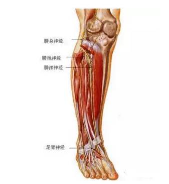 腓总神经于腘窝上方自坐骨神经分出,绕过腓骨头而至小腿前部,分出腓肠外侧皮神经,分布于小腿外侧面,然后形成腓浅神经和腓深神经。腓浅神经支配腓骨长肌和腓骨短肌,并分出足背内侧皮神经和足中间皮神经,分布于2~5趾背侧皮肤。腓深神经支配胫骨前肌、(足母)长伸肌、(足母)短伸肌和趾短伸肌,并分出皮支到1、2趾间背侧。