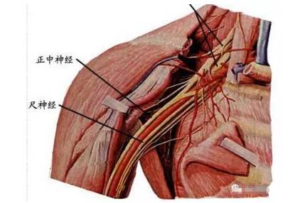 尺神经(C7~T1)发自臂丛内侧束,沿肱动脉内侧下行,至三角肌止点以下转至臂后面,继而行至尺神经沟内,再向下穿尺侧腕屈肌至前臂掌面内侧,于尺侧腕屈肌和指深屈肌之间、尺动脉内侧继续下降到达腕部。在腕部,尺神经于腕骨的外侧穿屈肌支持带的浅面和掌腱膜的深面进入手掌。