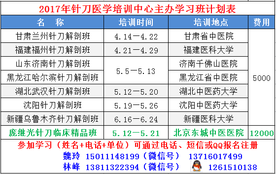 为了进一步规范中国原创针刀医学技术,提高中国针刀医学专业医师操作技术水平,增强利用针刀医学技术更广泛的为患者服务的能力,普及与推动全国针刀医学的发展,由庞继光针刀医学研究院主办的 “针刀医学精品临床与精细解剖培训班”(项目名称:针刀医学培训班 项目编号:Z20170106004) 定于2017年5月12日至5月21日在北京东城区中医医院举办。本班将原针刀医学基础班、综合班、解剖班、手法班、颈腰椎病专题班中临床效果独特、安全易操作的内容融为一体,采用课堂与临床实践紧密相结合,老师与学员互动教学方式,一对一专门辅导。