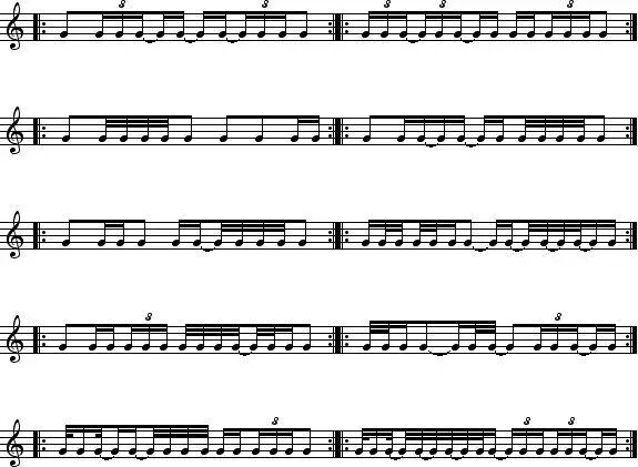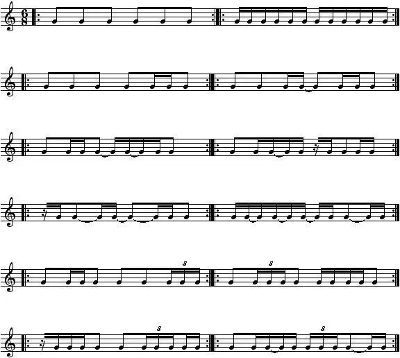 下面我列举一些基本的节奏练习,大家熟练后要做音阶练习并创造更多的节奏组合,直至能自由组合来做即兴。这些节奏练习同样适用于3/4、6/8、12/8节拍的爵士风格的乐曲。