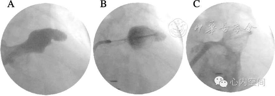 A:穿房间隔后左心耳造影可测量左心耳尺寸;B:经封堵器内腔注射造影剂可通过封堵面后的造影剂染色情况判断位置及封堵情况;C: