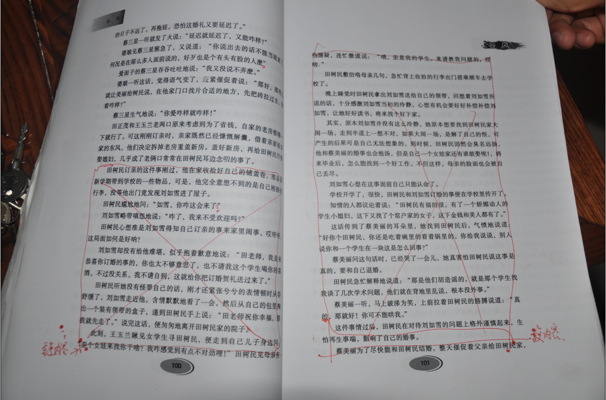 “好小说好文章是改出来的”去年夏天初稿写成后,冉学东又进行了反复修改。每天傍晚小小的茶社里,常会聚集很多文学爱好者,大家针对原稿中的问题畅所欲言,冉学东都会虚心记录,做好修改的标记。“从初稿到定稿已经不下10余次的修改。”翻动着曾经的修改稿,记者看到厚厚的本子上,密密麻麻地做了很多红色的修改标注。