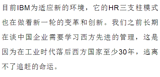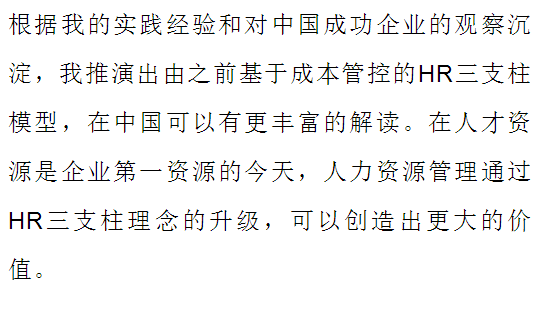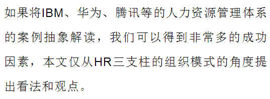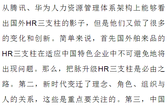 戴维·尤里奇和IBM创立的HR三支柱IBM核心还是基于成本控制,中国成功实施HR三支柱的企业,他们的应用往往不是基于成本,而是基于组织的价值创造,基于激发人的价值创造潜能,激发组织价值创造的能力。总结来说,以华为和腾讯为代表的一批中国企业在应用HR三支柱时,不是成本驱动而是价值驱动,使人力资源管理真正能够从职能管理层面上升到战略和经营层面,从而为组织、员工创造价值。马海刚从五个方面论证了中国企业为什么要推行HR三支柱模式,推行HR三支柱模式对中国企业的价值。我来做如下点评: