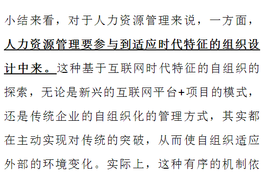 第一,人力资源管理发展到今天,还是要参与到适应这个时代“人的需求变换”与“组织变革”的设计中来。这些变化中,首先是人的需求变换,现在员工更有自我驱动的诉求,人力资源管理要考虑的问题是如何通过组织设计、机制设计激发人的价值创造活力和潜能。其次是组织的变革趋势,未来的组织更多采用大企业平台+小公司精神的模式,这意味着组织一方面要平台化,另一方面要“微化”,这种组织模式应该说也是要激发组织的价值创造活力,提高组织的外部适应力,对外部市场的反应能力。HR三支柱正是一种适应组织与人的变化的一种模式。一方面,通过满足人才需求,激发人的价值创造活力和潜能;另一方面,人力资源管理通过适应新的组织形态,提升组织战略适应性,同时促进业务的发展,推动整个组织更快、更敏捷地去面对市场和客户。