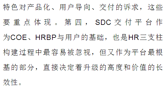 第四,HR三支柱能够让以人为本的理念落地。腾讯HR三支柱的实践,将SSC升级为SDC,真正使得人才管理实现了客户化的过程。我们很早就提出人才是客户的理念,但工作中怎么去体现人才是客户呢?实际上就是要基于人才的需求,去研究并开发出人力资源管理的产品服务。要开发出人力资源管理的产品和服务,就需要从职能上设立人力资源产品经理、人力资源大客户经理。人力资源管理不仅仅是提供所谓的平台,而是要有面对客户的意识,要有交付的思想。