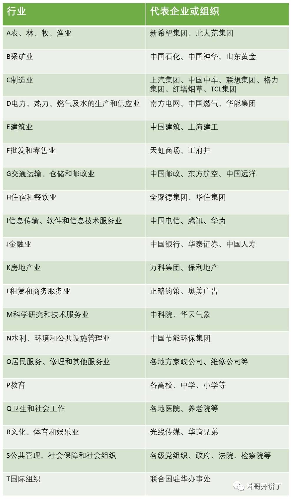 说了半天,可能有的人还是心有疑惑,我们日常见过或听过的企业,都属于什么行业呢?下面,请你看一张表格,我将20个行业门类和它们的代表企业列在了一起,看过之后,相信你对这20个行业门类就会有更清晰的理解。