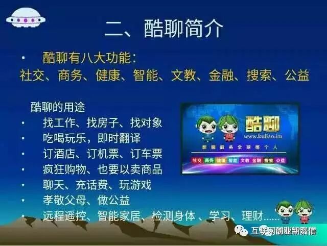 大家有知道QQ是怎么普及的吗?淘宝又是怎么普及的,百度又是怎么普及的?每一款软件都有前期市场推广员推广,最后才被大众所熟知到接受使用,我们接受使用这些软件时是否是在周围人都用时你才开始用的呢?这个过程是由谁完成的呢? 这下明白为什么要做宇飞来酷聊内部会员了吗?淘宝,QQ,百度,这些前期推广员,哪个不是身家百万,千万,可你又知道有多少人在为他们源源不断的创利呢?宇飞来酷聊,它是一款万网归一的高科技软件,它比我们现在使用的微信还要先进近40倍,免费下载,免费使用,告诉亲,全国内部招聘分销商,它也和QQ的一批推广员一样哦!它又给了我们这样的一次机会,朋友,你愿抓住吗?  酷聊软件功能 ....酷聊来了,你准备好了吗? 用酷聊..聊天, 用酷聊..购物, 用酷聊..充话费 用酷聊..支付转帐, 用酷聊..看影视玩游戏, 用酷聊..远程遥控智能家居, 用酷聊..检测身体, 用酷聊..学习, 用酷聊..订机票车票 用酷聊..旅游 用酷聊..智能管控 用酷聊..智能报警 用酷聊..远程挂号会诊 用酷聊..开店, 用酷聊..找对象, 用酷聊..找工作, 用酷聊..股票分析 用酷聊..理财资产管理 用酷聊..和国际友人一起做生意 用酷聊..与世界各国朋友们交流无障碍 用酷聊..监控孩子的安全, 用酷聊..关心孝敬父母, 在酷聊..买一部手机可创业,相当于0投资——这些理由够吗?