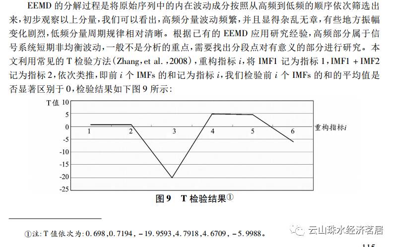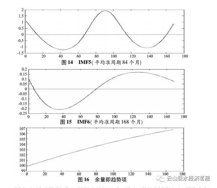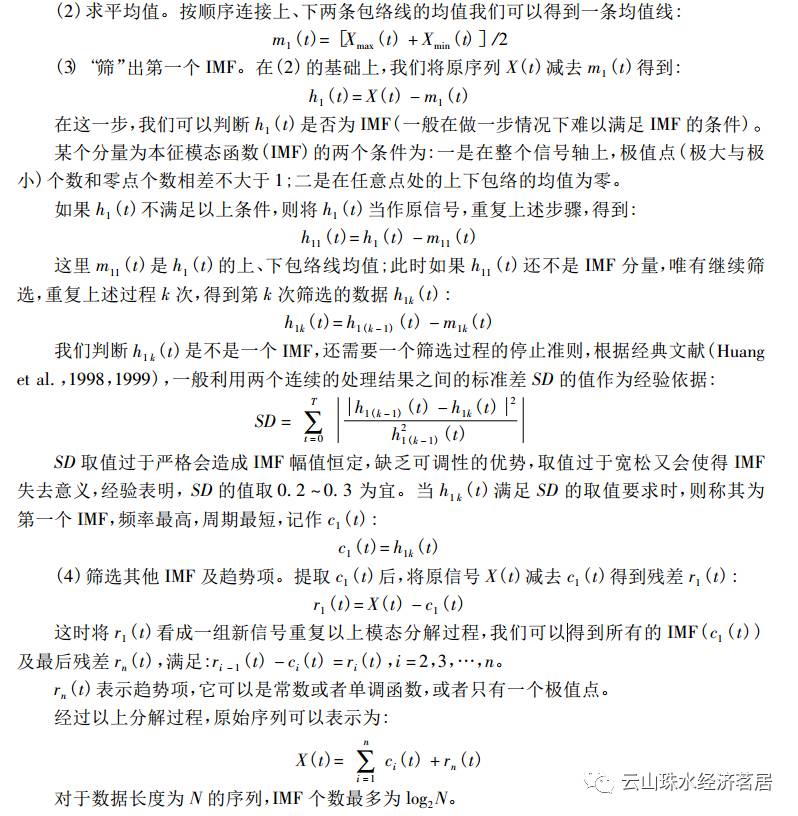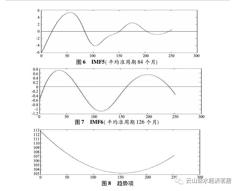 至此,我们可以通过以上程序将原序列按照频率从高到低的顺序将内在准周期分量逐级分解出来,整个分解过程是自适应的,直接的,完备的,有效的,近似正交的,原序列的局部性质得以保留,与现有的处理时间序列方法相比,EMD的最显著的特征是自适应性,即不需要对原序列进行预处理,对主观因素的污染具有天然的免疫力,因此容易还原样本的本来面目,能有效避免研究结论的失真。