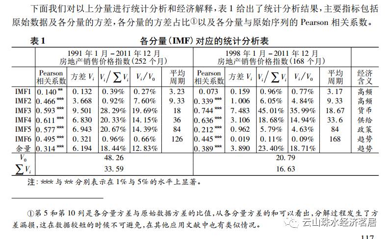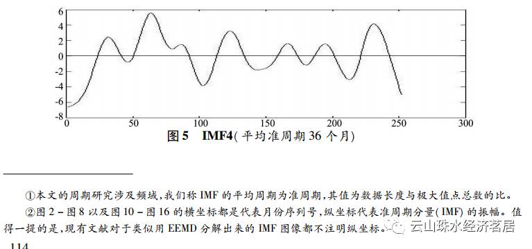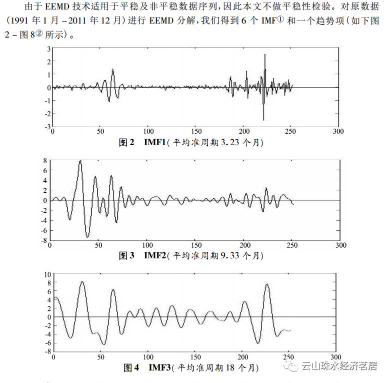 下面我们对以上分量进行统计分析和经济解释,下表1给出了统计分析结果,主要指标包括原始数据及各分量的方差,各分量的方差占比以及各分量与原始序列的皮尔森相关系数。从表中分析结果可以看出,除了高频波动个别分量外,其余IMF与原始序列是相关的,而且几乎都在1%的水平上通过显著性检验。同时,我们发现除了由于数据长度的原因引起最后一个IMF的平均准周期有明显差异外,其他的对应的IMF的准周期基本一致,说明我们用EEMD技术识别周期很可靠。下面我们依次对IMF的含义进行分析。