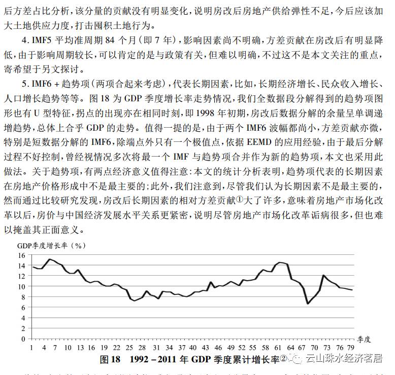 总体来看,每个IMF的方差贡献及其经济含义在逻辑上是自洽的。我们的研究发现,货币因素贡献最大,房改后高达45.01%,同时发现近期投机猖獗,之所以有投机的存在,其实取决于两个关键的条件,一是要有充裕的资金,二是房地产供给缺乏弹性,而这两个条件刚好在本文的实证结论中得到满足。如果市场上没有充裕的资金储备,不管预期投机前景如何的美好,智慧如何的汹涌,一切终将成为无源之水,无水之木;同样如果房地产供给弹性无穷大,再多的货币之水也会被庞大的市场吞没,投机冲动将缺乏根基。