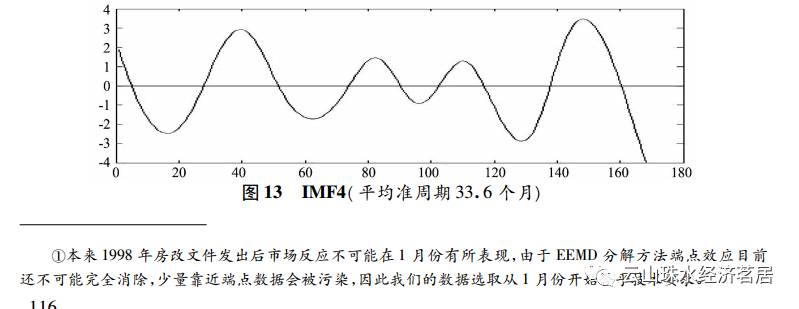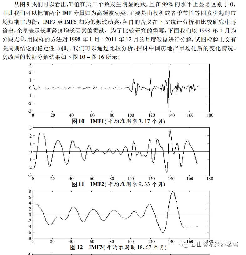 (一)IMF1及IMF2平均准周期分别为3个月和9个月左右,代表高频波动,市场表现为短期非均衡,一般由投机力量或者季节性因素驱动,然而季节性调整波幅应该合乎周期规律而不会异常变化,在图2、图3以及图10、图11中我们可以看出不管数据分段与否,大概从2009年开始,波幅突然增大,说明金融危机之后投机更加猖獗,一个可能的解释是,金融危机发生后,企业家不愿意继续或者重新涉足利润率较低的制造行业,大量资金涌入了房地产市场,当然这也与中国金融市场不够发达,缺乏足够投资渠道有关,在股市低迷的情况下,唯有房地产市场受青睐。此外我们在图3中还可以识别90年代初期的房地产投机行为。
