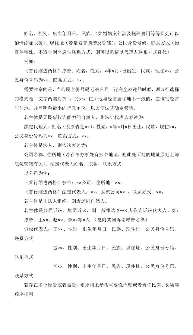 说明:信息的重要性程度依原被告身份以及该信息所代表的含义不同而产生不同的评分标准,如被告联系方式的缺失显然比原告该项信息的缺失要严重,此外,公民身份号码的准确性较联系方式以及职务(公司法定代表人)等信息来说也更为重要,在评价时要酌情考虑。需要说明的是,实践中原告联系方式若因案情特殊不便记于诉状中,则可用委托代理人的联系方式予以替换。此外,在侵权案件中存在多个当事人的情况下,何者为第一被告、何者为第二被告原则上依其责任程度而定,在存在多个原告的情况下,原则上依照长幼或者重要性程度而定,依具体案件酌情判断。在劳动案件中,对于主体部分是公司但是在其他地方设立办事处且当事人在该办事处办公,在陈述公司住所地时具体要看管辖,如果想在注册地管辖则陈述注册地地址,如果想在该办事处管辖则陈述该办事处地址,且在该公司名称之后括号备注办事处名称。