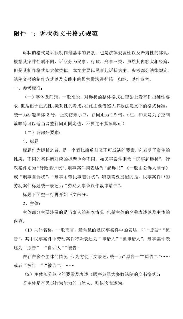 格式的规范关乎对于整篇文书的细节性评价,主要包含语言的把控、标点的使用、字体的运用以及整体排版的结构等等。法律文书的写作要力求法言法语,尽量使用书面化语言,用词要质朴、庄重,这是一个法律人应有的职业习惯。另外,语意表达要准确明了,不产生歧义,无错别字,标点使用正确,统一字体和排版,这是包括诉状类文书在内的任何文书写作最基本的要求。