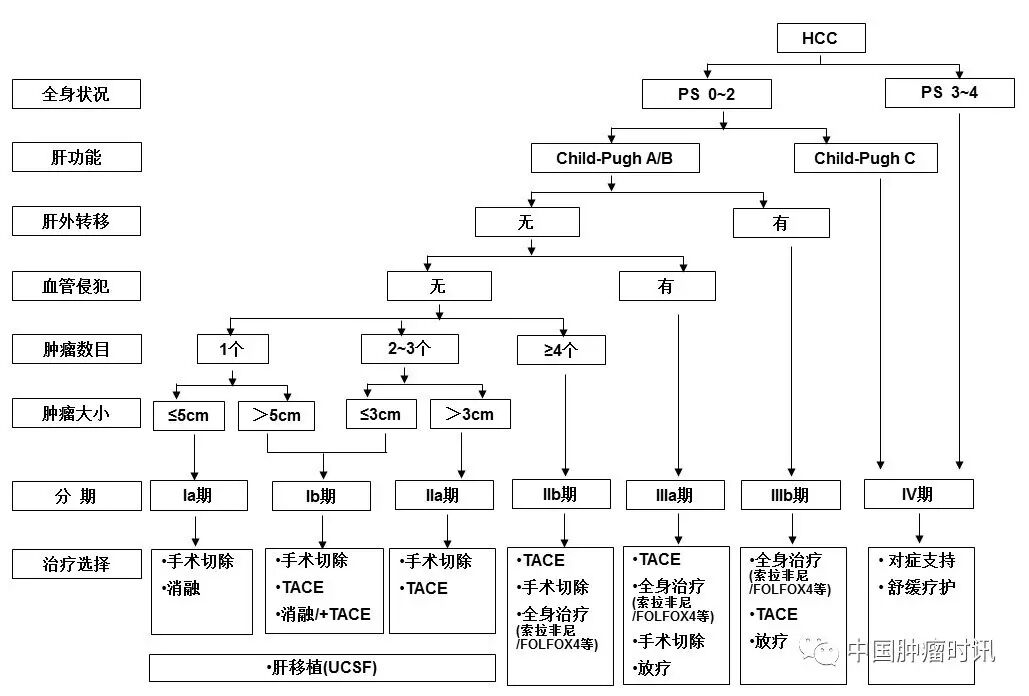 影响肝癌病人预后的因素很多,包括肿瘤因素、病人一般情况及肝功能情况,据此国外有多种的分期方案,如:BCLC、TNM、JSH、APASL等分期。依据中国的具体国情及实践积累,推荐下述肝癌的分期方案: