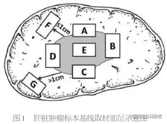(2)标本取材要点:肝癌周边区域是肿瘤生物学行为的代表性区域26 。为此,应采用“7 点”基线取材法 (图 1) ),在肿瘤的 12 点、3 点、6 点和 9 点位置上于癌与癌旁肝组织交界处取材按 1:1 取材;在肿瘤内部至少取材 1 块;对距肿瘤边缘≤1cm(近癌旁)和>1cm(远癌旁)范围内的肝组织分别取材1 块。鉴于多结节性肝癌具有单中心和多中心两种起源方式,在不能除外由肝内转移引起的卫星结节的情况下,单个肿瘤最大直径≤3cm 的肝癌,应全部取材检查。实际取材的部位和数量还须根据肿瘤的直径和数量等情况考虑27 (证据等级 2)。