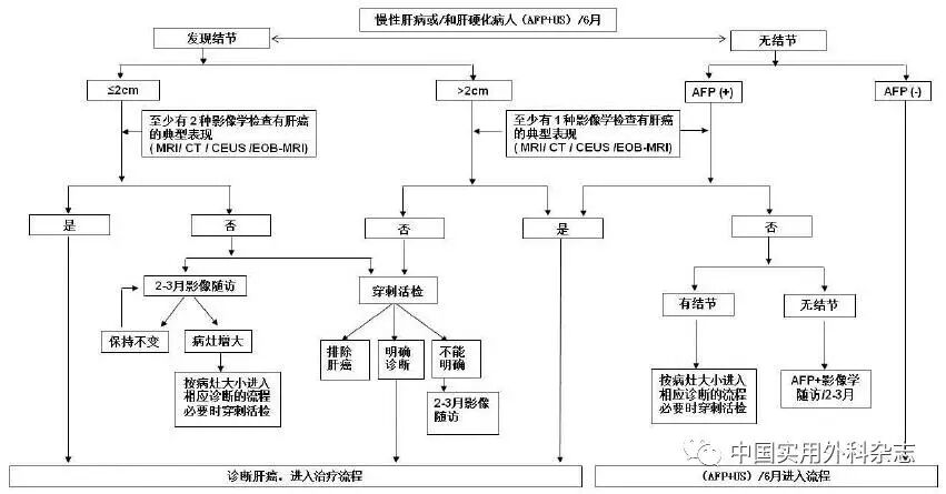 2. 有乙型肝炎或丙型肝炎,或者有任何原因引起肝硬化者,随访发现肝内直径≤2cm 结节,若上述四种影像学检查中无或只有一项检查有典型的肝癌特征,可进行肝穿刺活检或每 2-3 个月密切的影像学随访以确立诊断;对于发现肝内直径>2cm 的结节,上述四种影像学检查无典型的肝癌特征,则需进行肝穿刺活检以确立诊断。