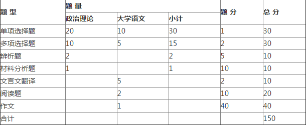 ,。、思想道德修养与法律基础的基础知识和基本理论掌握情况,。大学语文部分主要通过文学常识、阅读理解、古今优秀作品的赏析和写作等多方面考查,检查学生的文学积累、语言表达能力和运用已有知识分析问题的能力。