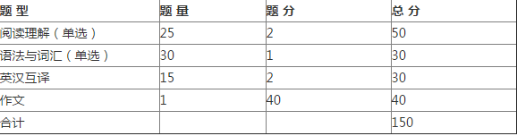 本考试共有4个部分:包括阅读、翻译、写作、语法与词汇,考试时间150分钟。
