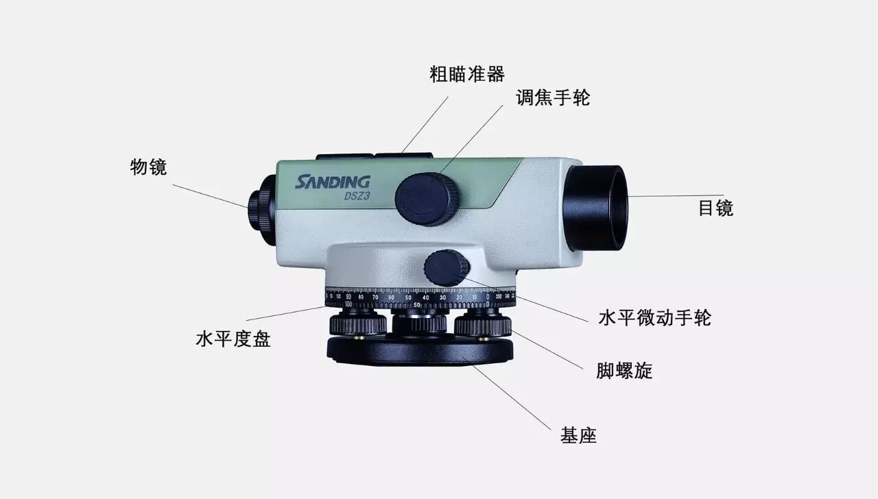 2.水准仪1.水准仪的作用就是提供一条水平视线(视准轴)。2.按精度水准仪可分为DS05、DS1、DS3、DS10等几个等级:DS05-----每千米水准测量的全中误差为±0.5 mm,用于高等级水准测量;DS1-----每千米水准测量的全中误差为±1.0 mm,用于高等级水准测量;DS3-----每千米水准测量的全中误差为±3.0 mm,用于一般工程测量和地形测量;DS10-----每千米水准测量的全中误差为±10.0 mm,用于一般工程测量和地形测量。DS为“大地”、“水准仪”的汉语拼音缩写,本节主要介绍DS3级水准仪。DS3水准仪由照准部和基座两部分组成。