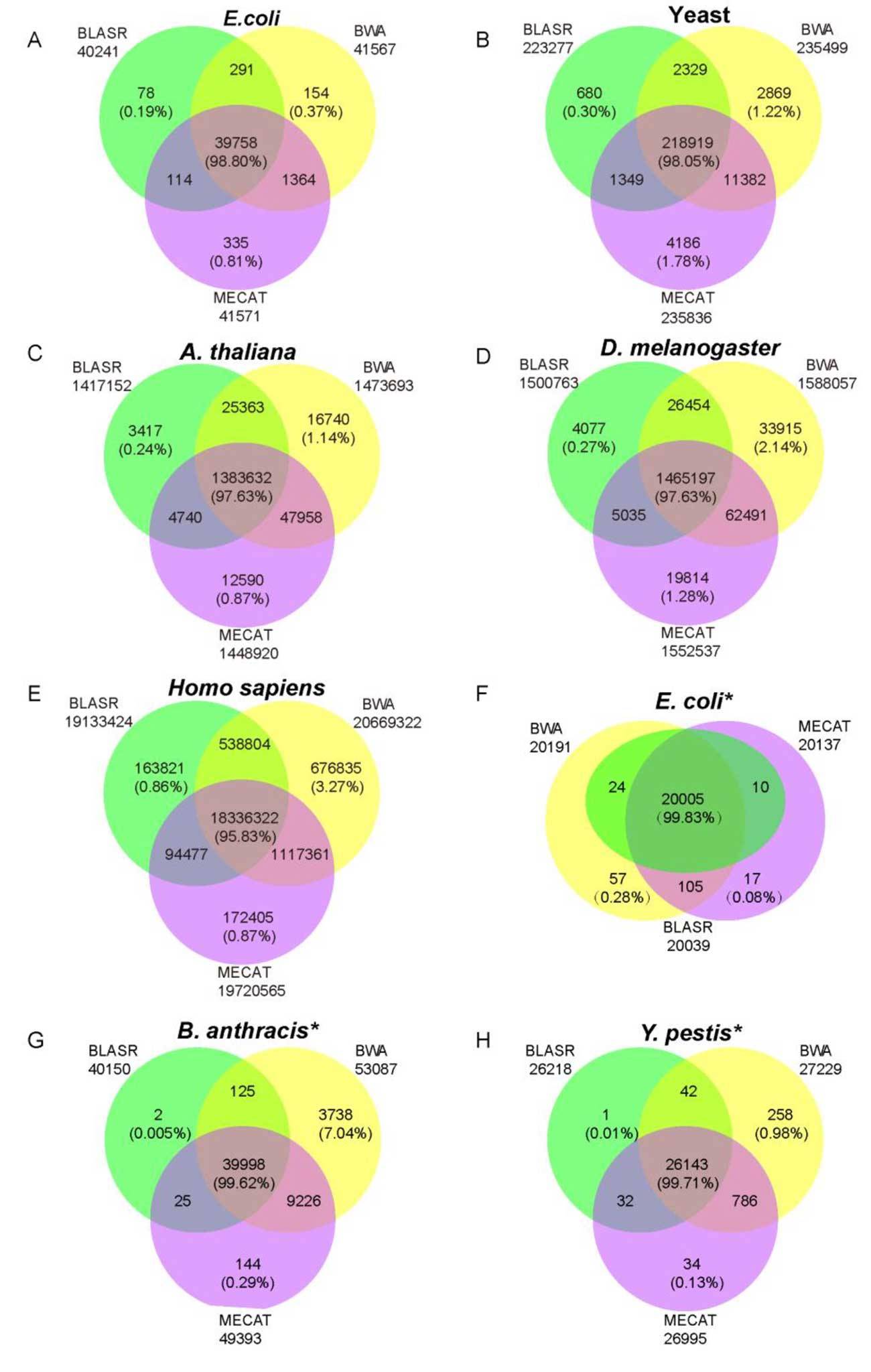 同时,三种比对算法的比对重叠率高达95-99%,这也表明MECAT的高可信度(Figure 2)。