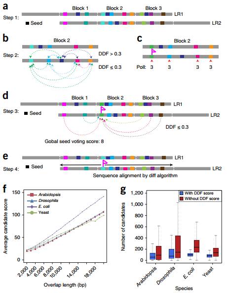 MECAT比对中采用全局种子打分算法,将长序列分成多个Blocks,序列间Blocks的k-mer进行比对(Figure 1a),以其中Block2为例,通过DDF(距离差异因子)对k-mer pair间打分(Figure 1b),以分数最高的为K-mer pair种子(Figure 1c),再以K-mer pair种子对其他block打分(Figure 1d),最后确定了2条序列间关系(Figure 1e),最终减少了局部序列比对的候选区域,进而减少比对所耗费时间。比较分析发现,通过DDF可以过滤掉50%-70%的候选区域比对(Figure 1g)。