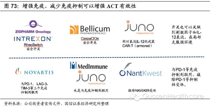 通过IL12、IL15共表达和免疫检查点抑制剂联合用药可以增强有效性。当前在实体瘤中存在免疫微环境抑制、细胞外基质阻隔、缺氧环境等因素限制,使得ACT治疗效果不如血液瘤。但是通过开关选择性在癌症区域表达免疫增强因子、与PD-1、LAG-3、TIM-3等检查点抑制剂联用、敲除PD-1、KIR受体等方式,在动物实验中能够观测到增强的抗癌效果。
