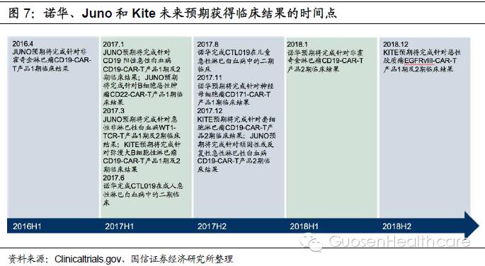 CAR-T过继细胞疗法有望成为血液癌疗法新标准。自2012年以来,标靶为CD19的CAR-T在急性淋巴白血病的治疗中取得了非常好的效果2014年10月,Carl June团队对诺华的抗CD19的2代CAR-T发布II期中期结果,30个病人(25个是儿童)中,在治疗后第一个月达到90%的完全缓解率。从包括其他组的临床研究上看,针对CD19靶点治疗B细胞起源的淋巴瘤或者白血病普遍达到60-85%的客观反应率。由于优秀的疗效,CAR-T在白血病和淋巴癌等适应症的获批的确定性是很高的。根据现有的试验进度,诺华期待于2016年底或2017年初获批。Juno与Kite将会随后完成。