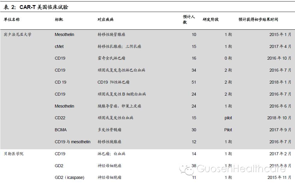 美国临床血液瘤为主,实体瘤进展欠佳。美国在研项目临床项目仍然以CD19为主,在实体瘤方面大多仍处于1期,并且已报告的结果并不好。例如宾夕法尼亚大学用mRNA暂时表达SS1抗mesothelin的临床1期实验中,虽然观察到了腹水中癌细胞减少,但是效果短暂,很快病程就进一步恶化了。这与初期研发采用了鼠源性抗体并产生了自身免疫有关。贝勒医学院采用2代CAR-T以HER2靶点治疗神经胶质瘤的1期临床中,16个病人只有1个达到部分缓解(Partial response,PR),7个病情稳定(Stable disease,SD)。贝勒医学院以GD2为靶点治疗神经胶质瘤的早期研究中曾经有3/11的病人达到短暂的完全缓解 (Complete response,CR),但是具有共刺激因子的研究结果还需要观察。