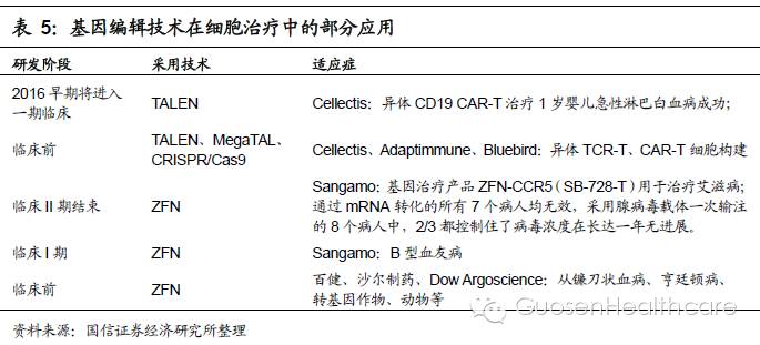 基因编辑在临床应用上仍然处于早期,主要应用仍然在科研领域。传统上基因编辑技术主要用于缺失某种正常蛋白的的罕见病领域,例如Bluebird Bio在镰刀血病中就是利用MegaTAL实现基因编辑。在过继免疫细胞治疗领域, CAR-T与TCR-T公司(例如Cellectis、Adaptimmune)等都采用基因编辑敲除内在TCR和MHC的方法制作通用细胞,另外敲除CD52也可以获得对化疗药物的耐药性。总的来说,虽然前景广大,但是技术本身还处于临床研究期,离大面积进入应用还有段距离。
