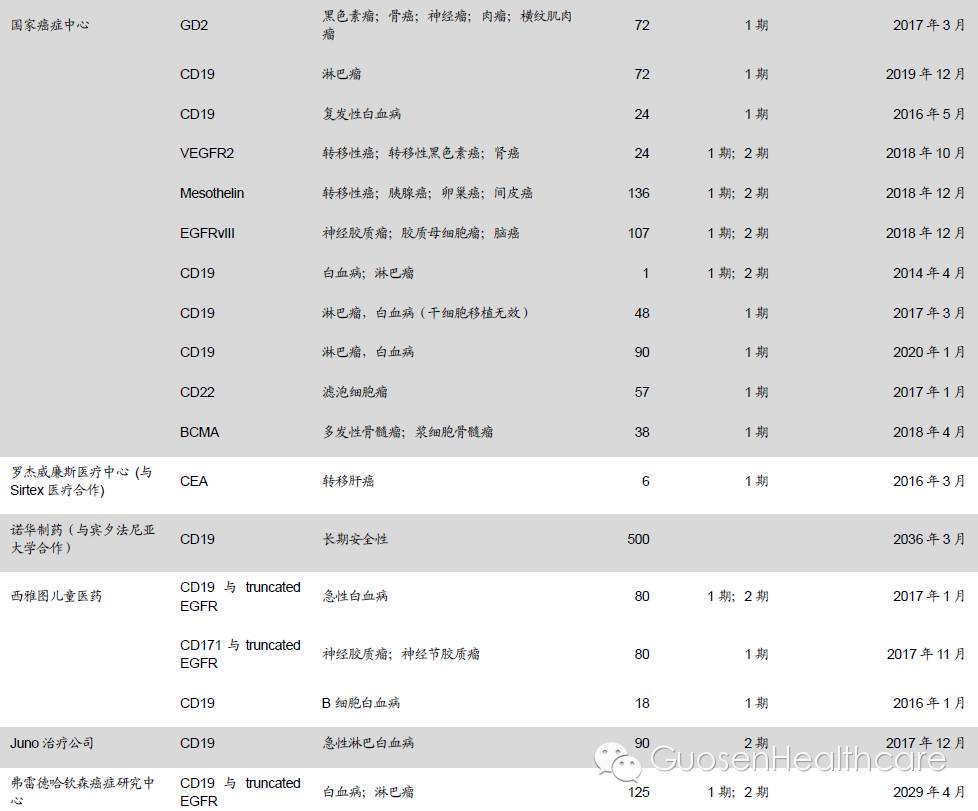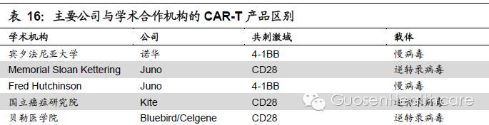美国CAR-T临床试验现状:知名学术机构执行,众多公司参与。细胞治疗源于美国,领先全球。Carl H. June团队来自于宾夕法尼亚大学,在临床上领先,预期16年7月将会得到CD19治疗急性淋巴白血病的2期临床结果。其他临床进度和数量领先的临床机构包括贝勒医学院(Baylor college of medicine)、纪念斯隆凯特林癌症中心(Memorial Sloan Kettering Cancer Center,MSKCC)、国立癌症研究院(National cancer institute, NCI)、MD Anderson癌症中心、西雅图儿童医院、弗雷德哈钦森癌症中心(Fred Hutchinson cancer research center,FHCRC)等。需要注意的是,很多以临床单位申报的临床试验其背后实际上是公司支持的项目,例如FHCRC与MSKCC申报的CAR-T项目实际上就是Juno公司的在研项目。