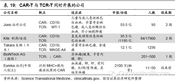 我国临床进度以301医院最早,还有西南医院(第三军医大学),主要原因在于部队系统之前不受卫生系统管制,在2015年5月放松管制之后迅速扩大。西比曼、科济生物、博生吉、雅科生物、北大未名等后发企业将目光同时瞄准了实体瘤和血液瘤:西比曼生物科技收购了301医院4个CAR-T产品并拥有后续产品的优先权;科济生物独有的GPC3靶点治疗肝癌和EGFR治疗神经胶质瘤;雅科生物在同济医院和陆道培血液肿瘤中心进行CD19产品临床试验;博生吉在精囊腺癌中MUC1靶点的CAR-T产品取得初步疗效;北大未名生物研究所在安医大二附院做CD19临床。