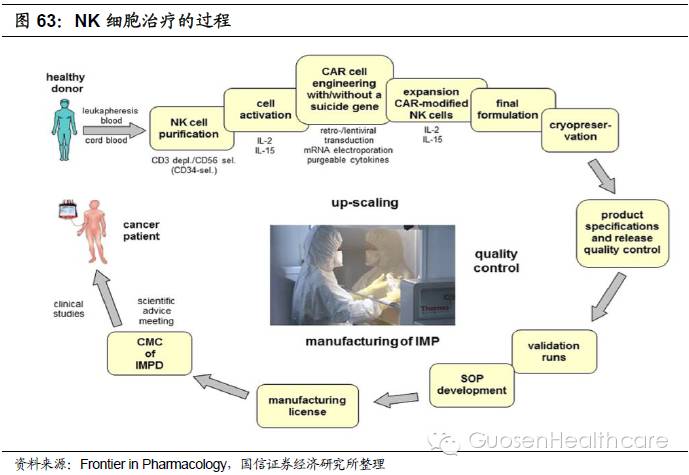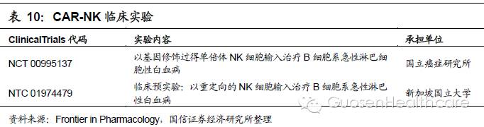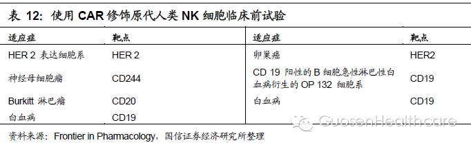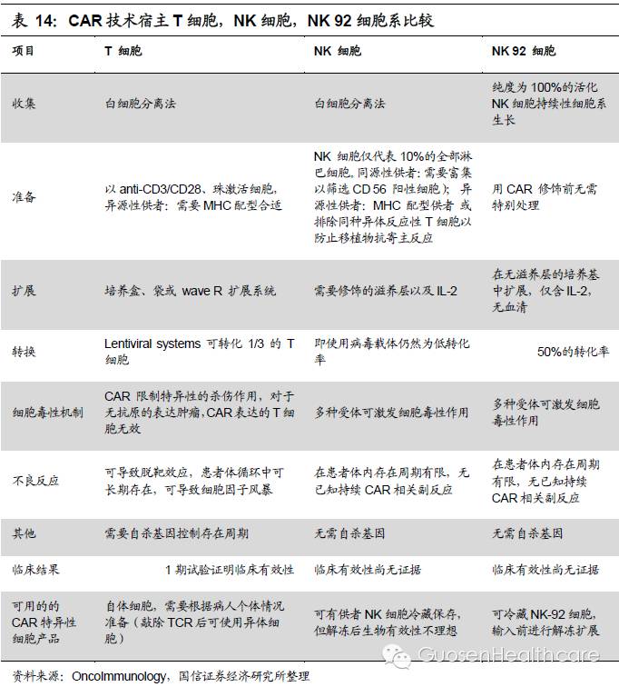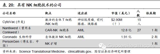 NK细胞相比T细胞具有非特异性、寿命短等特点。CAR-NK技术海内外对标都比较少见。海外可以对标的企业是Nantkwest,13.9亿美元的市值。与CAR-T比较,CAR-T细胞只依靠CAR来识别肿瘤细胞,而NK细胞可以同时通过其他受体介导免疫反应(NCR1,NCR2,NCR3等);其次NK细胞的细胞因子释放与T细胞不同,不会产生危险的细胞因子风暴;第三NK细胞寿命较短,不管是异体的还是自体的,不需要设计基因,安全性高;第四有报导认为NK细胞较易浸润实体瘤。当然NK细胞也存在缺点,例如寿命短(数天),那么无法维持长期有效的话制备过程总成本会过高。