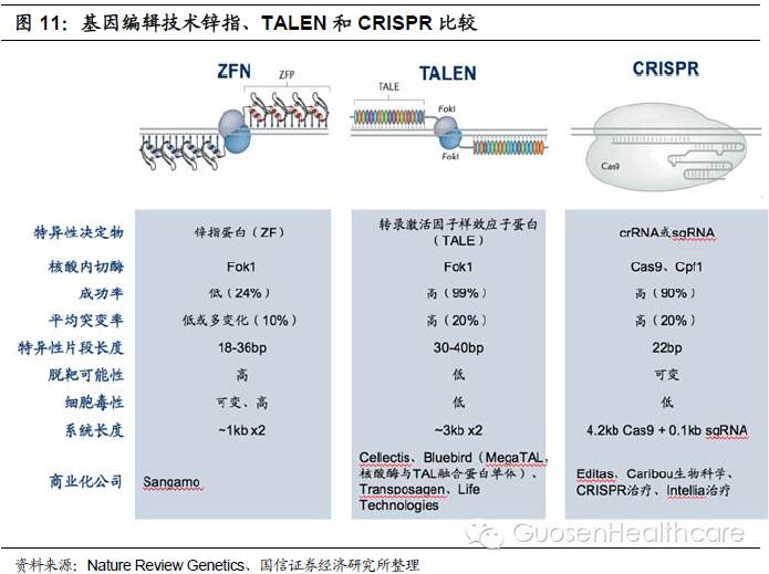 当前基因编辑技术主要是三种:ZFN、TALEN、CRISPR,各具优势。基因编辑的性能指标主要是基因编辑的效率和特异性。要达到特异性,已往利用的是融合了核酸酶的特异性结合DNA的蛋白,例如锌指核酸酶(Zinc-finger nucleases,ZFN)或者转录激活因子样效应子核酸酶(Transcription activator-like effector nuclease,TALEN)。由于需要设计并表达蛋白,时间长成本高。CRISPR出现之后,直接使用核酸识别核酸的方式,而酶则是通用的Cas9或者Cpf1,所以大幅降低了成本。ZFN技术出现最早,所以用于临床实验的数量较多;当前TALEN技术仍然具有成功率高、脱靶可能低的优点,所以对于安全性要求高的临床应用更具吸引力;CRISPR技术已经在学术界成为标配,而且技术进化速度迅速,有望在未来获得更广泛的应用。