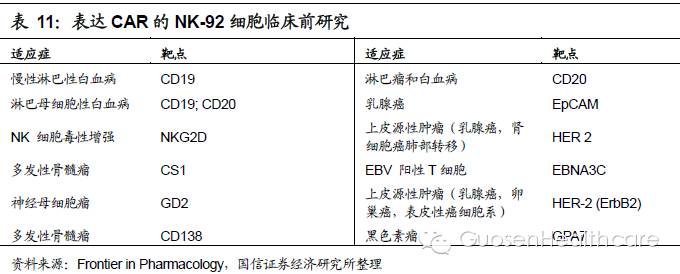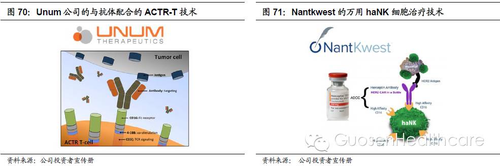 通用细胞可放大抗体药的效果。主要是两家公司:1)Unum的技术方案是设计的CAR-T仅包含共刺激信号部分,CAR识别抗原的svFv部分是可以与其他已上市抗体药结合的通用部分,未来需要治疗哪个靶点就同时输入该抗体即可。2)Nantkwest公司的haNK(ha代表高亲和性):传统抗体药起效需要CD16诱导NK细胞毒性,天然NK中可能只有20%具有高亲和性的CD16的变体表达。haNK转基因表达高亲和性的CD16,能够放大现有抗体药的疗效。预期16年开始临床1期。