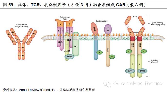 CAR是肿瘤抗体与T细胞激活信号的融合蛋白。如图所示,嵌合抗原受体(CAR)是由3部分融合得到人工细胞膜表面蛋白。这其中,最左侧的是肿瘤抗原的抗体,抗体的可变部分可以识别不同抗原,由一个重链(VH)和一个轻链(VL)组成。另外抗体还包括共同的不变部分组成。在CAR的设计中,只包括了可变部分。第二幅图是T细胞受体(TCR),可以识别MHC提纯出来的抗原,由一个α和一个β单元结合而成的二聚体决定的。CAR中包含的CD3是TCR的刺激信号。第三部分如CD28,4-1BB是维持T细胞存在与增殖的重要共刺激因子。嵌合抗原受体(CAR)是人工创造的膜蛋白,将抗体的可变部分, CD3ζ链与CD28/4-1BB等融合得到。
