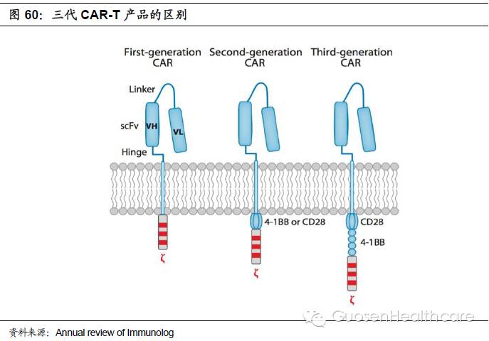 3代CAR-T技术的区别在于刺激信号。第一代CAR-T只有CD3ζ链;第二代将4-1BB或者CD28加入;第三代将两个信号同时加入;除了4-1BB和CD28,其他可能的共刺激因子还包括ICOS、CD27、CD134等。例如4-1BB(CD137)主要表达于CD8+的T细胞中,增强T细胞增殖,促进IL-2释放和细胞裂解活性;