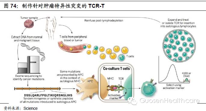 结合肿瘤基因测序实现终极个性化TCR-T医疗。通过对肿瘤样本的测序,精准的得到肿瘤特异性的突变,转基因这些序列进入APC细胞或者直接人工合成小肽,使得APC提呈相应突变并与自体的T细胞一起培养;由于被激活的T细胞会表达激活标记如4-1BB(CD8+)或OX40(CD4+),所以可以通过激活标记筛选出带有对应TCR的T细胞,扩增之后重新输回患者体内就是完全个性化的,只针对突变癌细胞而不针对正常组织的终极过继细胞治疗方案。